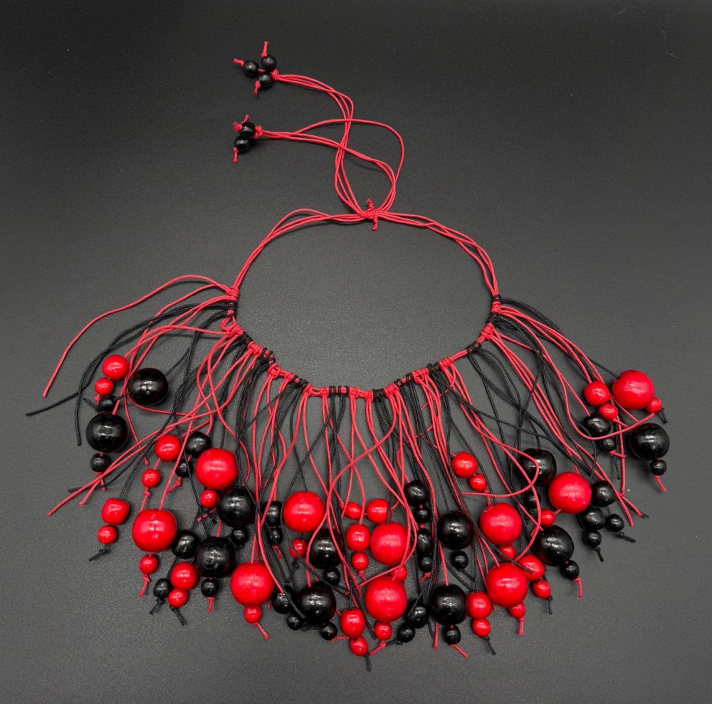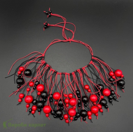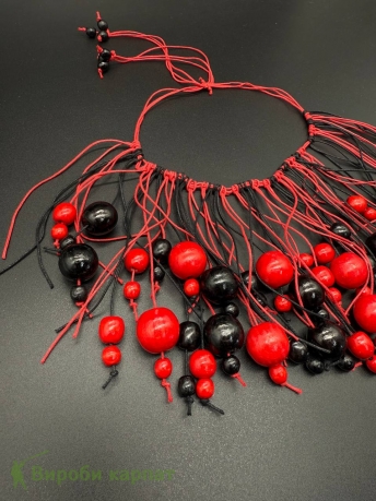 Яркое ожерелье из деревянных бусин в сочетании красного и чёрного цветов. Длинные шнуры создают эффект живого движения и выразительную композицию. Изготовлено из натурального дерева.