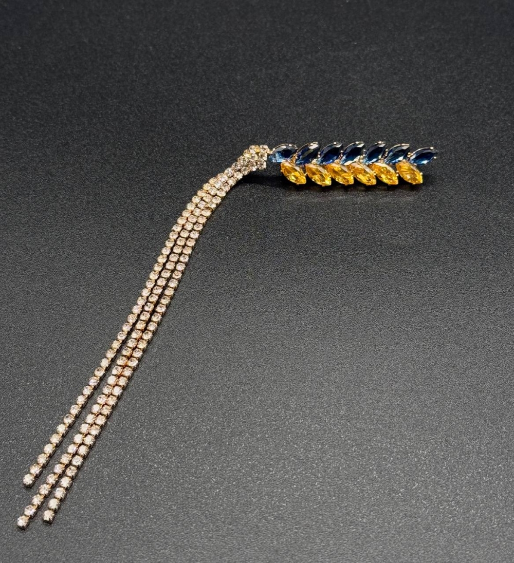 Изысканная брошь в форме веточки с кристаллами синего и жёлтого цвета, украшена тремя элегантными подвесками из блестящих страз. Символизирует патриотизм, утончённость и стиль