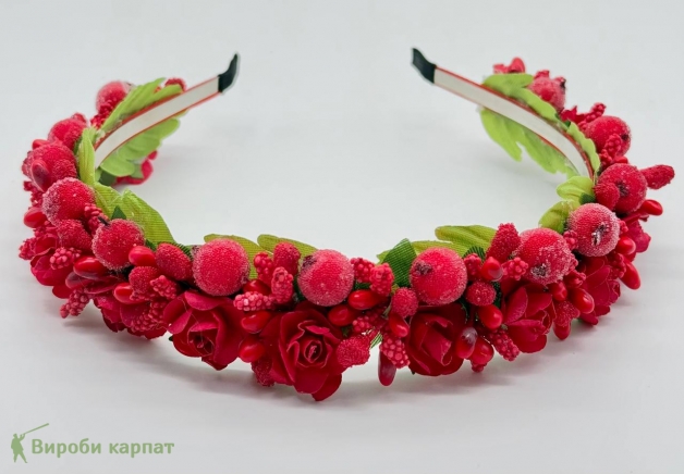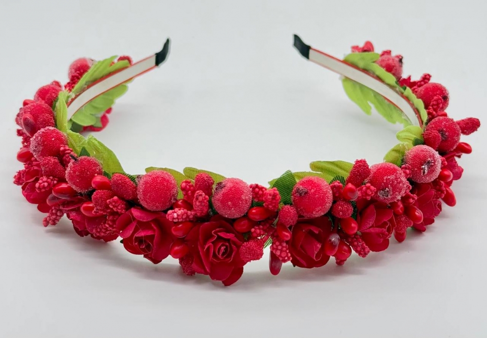 Яркий ободок ручной работы, украшенный насыщенно-красными розами, ягодами с эффектом инея и декоративными элементами. Смелый акцент для зимнего образа, фотосессий или праздничных мероприятий