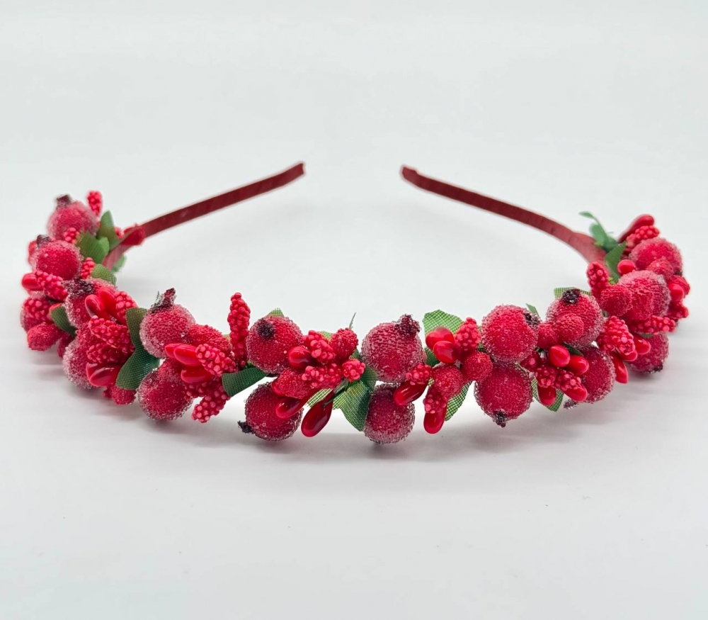 Яркий ободок ручной работы, украшенный декоративными красными ягодами с эффектом инея, зелёной листвой и жемчужными элементами. Идеально подойдёт для зимних фотосессий, новогодних праздников или как стильный акцент в образе