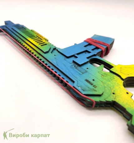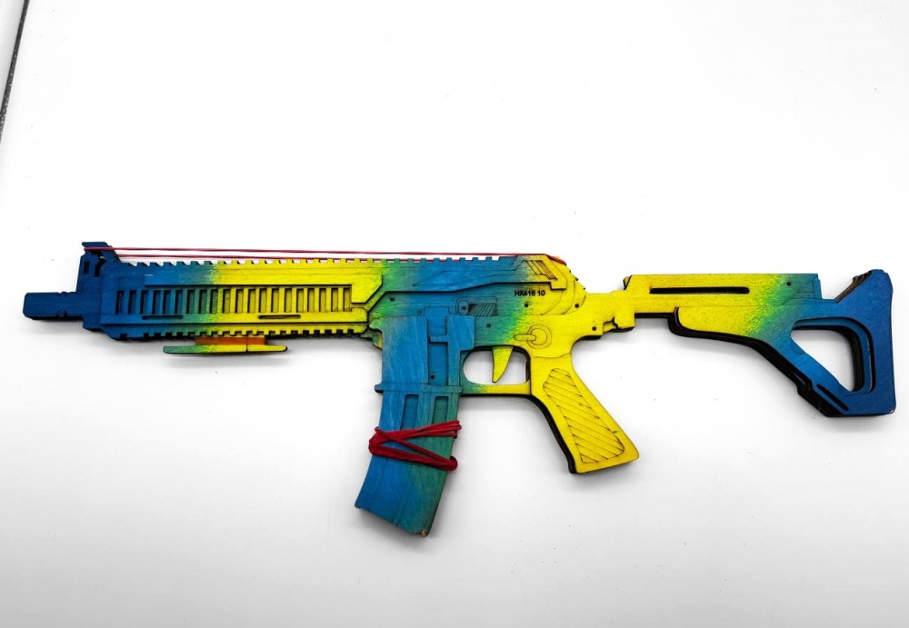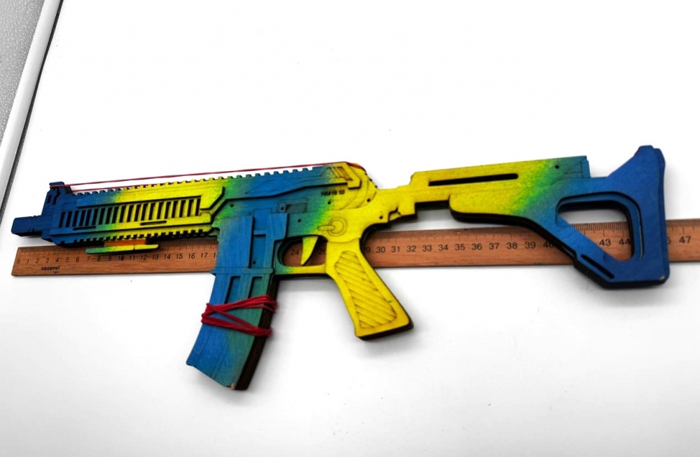 Автомат M4A4 из стреляющей резинками фанеры, механическая модель штурмовой винтовки, изготовлена из фанеры. Оснащена специальным механизмом для запуска канцелярских резинок. Используется для развлечения, тренировки точности и безопасных игр