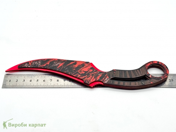 Лёгкий безопасный макет ножа карамбит с ярким красно-чёрным узором. Подходит для коллекций, фотосессий, декора, игр или в качестве сувенира. Имеет удобную изогнутую форму и кольцо для хвата