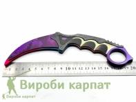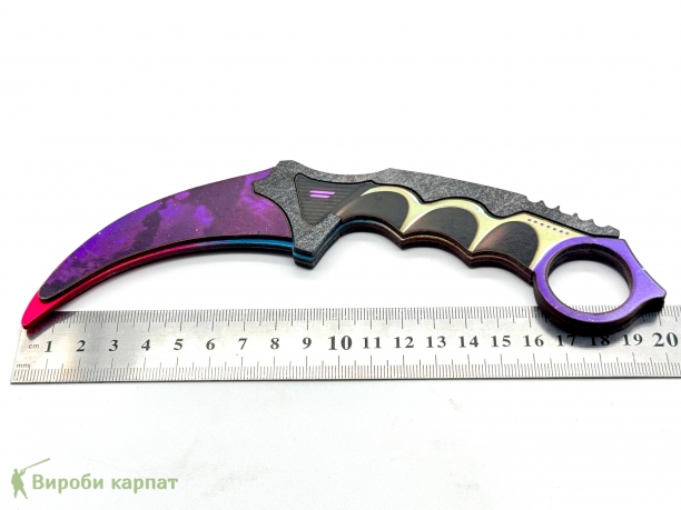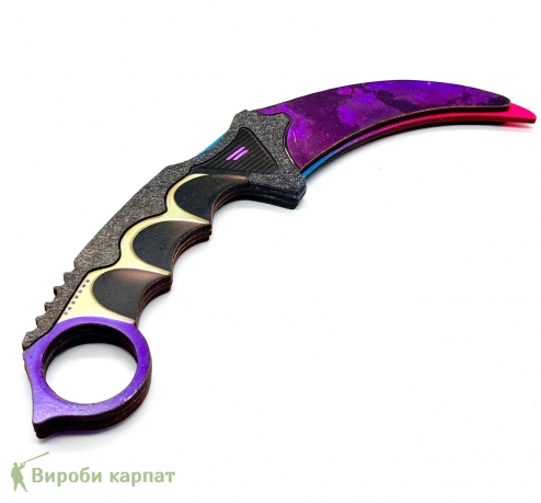 Лёгкий безопасный макет карамбита из дерева с яскравым фиолетово-рожевым принтом. Подходит для коллекций, игр, фотосессий, декора и подарков. Удобная рукоятка с выемками обеспечивает комфортный хват