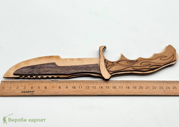 Игрушечный нож ручной работы из натурального дерева — стильный аксессуар для ролевых игр или коллекции. Элегантная форма, многослойная сборка и декоративная отделка рукоятки в виде пламени придают ему эффектный вид. Безопасен для детей, не имеет острых краёв. Отлично подойдёт как подарок или элемент интерьера.