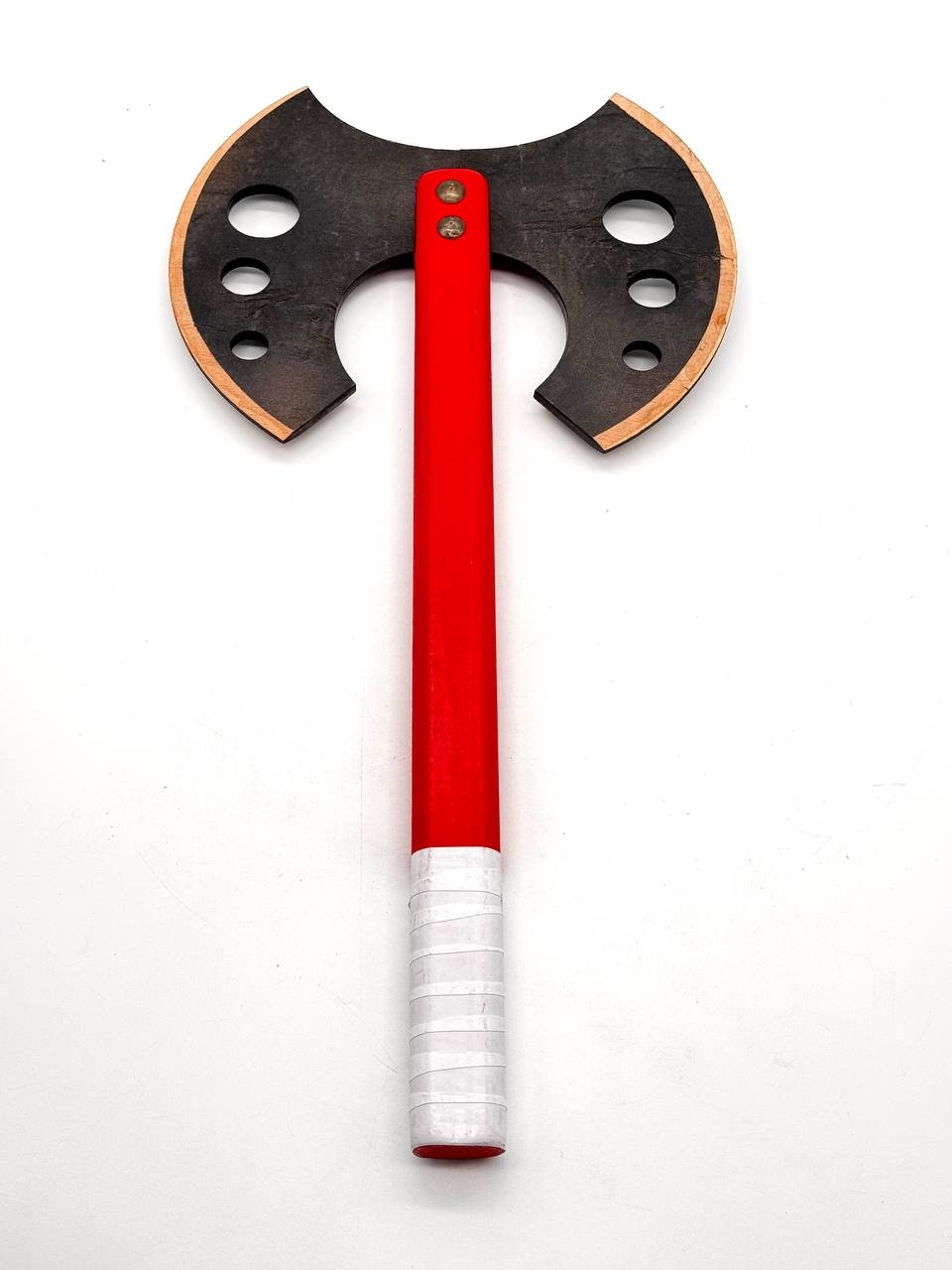Прочный и легкий деревянный топор с двусторонним лезвием. Изготовлен из качественной фанеры и дерева, подходит для ролевых игр, косплея или декора. Благодаря эргономичному дизайну и удобной рукоятке идеально подходит для использования в игровых или тематических мероприятиях.