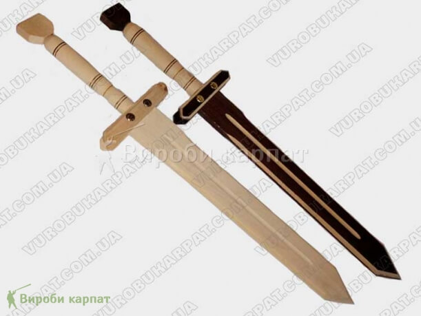 Деревянный игрушечный меч. Игрушка изготовлена из экологически чистого карпатского дерева (бук). Известно, что игрушечные мечи, боевые топоры, сабли и шашки были лучшими игрушками для мальчиков еще в глубокой древности. Взяв в руки деревянный меч, ребенок легко сможет представить себя в образе запорожского казака или былинного витязя. Детские деревянные мечи и сабли совершенно безопасны и могут стать прекрасным подарком для мальчика, в возрасте от трёх лет и старше. Длинна составляет 60 см, ручная работа, материал бук. Светлый и тёмный тонированный цвет.