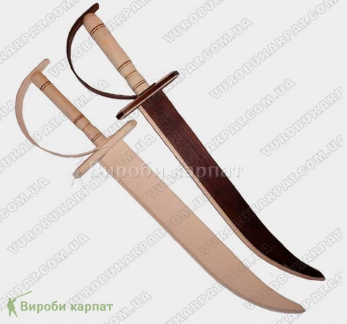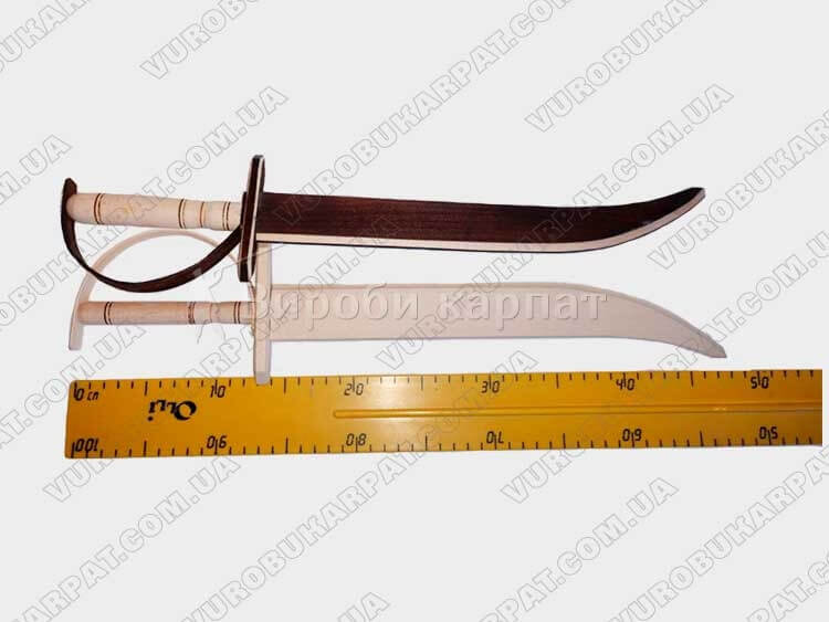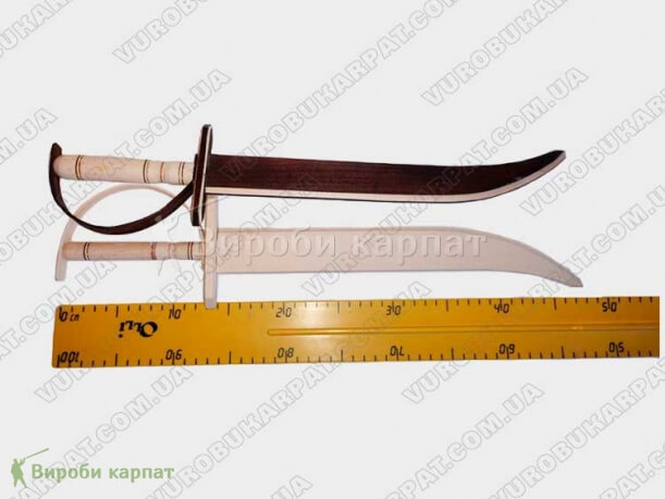 Деревянный игрушечная сабля. Игрушка изготовлена из экологически чистого карпатского дерева (бук). Известно, что игрушечные мечи, боевые топоры, сабли и шашки были лучшими игрушками для мальчиков еще в глубокой древности. Взяв в руки деревянный меч, ребенок легко сможет представить себя в образе запорожского казака или былинного витязя. Детские деревянные мечи и сабли совершенно безопасны и могут стать прекрасным подарком для мальчика, в возрасте от трёх лет и старше. Длинна составляет 50 см, ручная работа, материал бук.