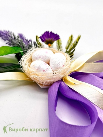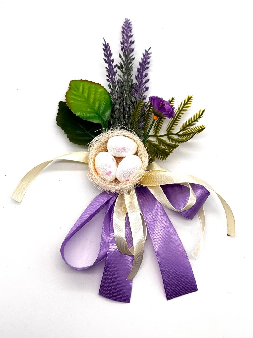 Изысканное украшение для пасхальной корзины с миниатюрным гнездом и декоративными яйцами. Выполнено в нежных пастельных оттенках с использованием искусственных цветов и атласных лент.