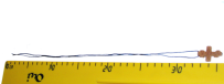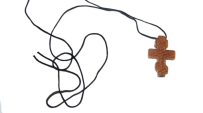 Деревянный крестик с нитью. С тиснением на котором изображено распятие Иисуса Христа.