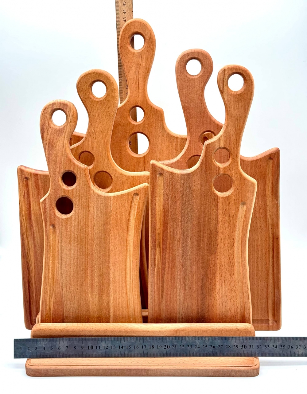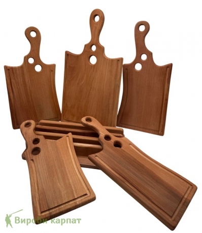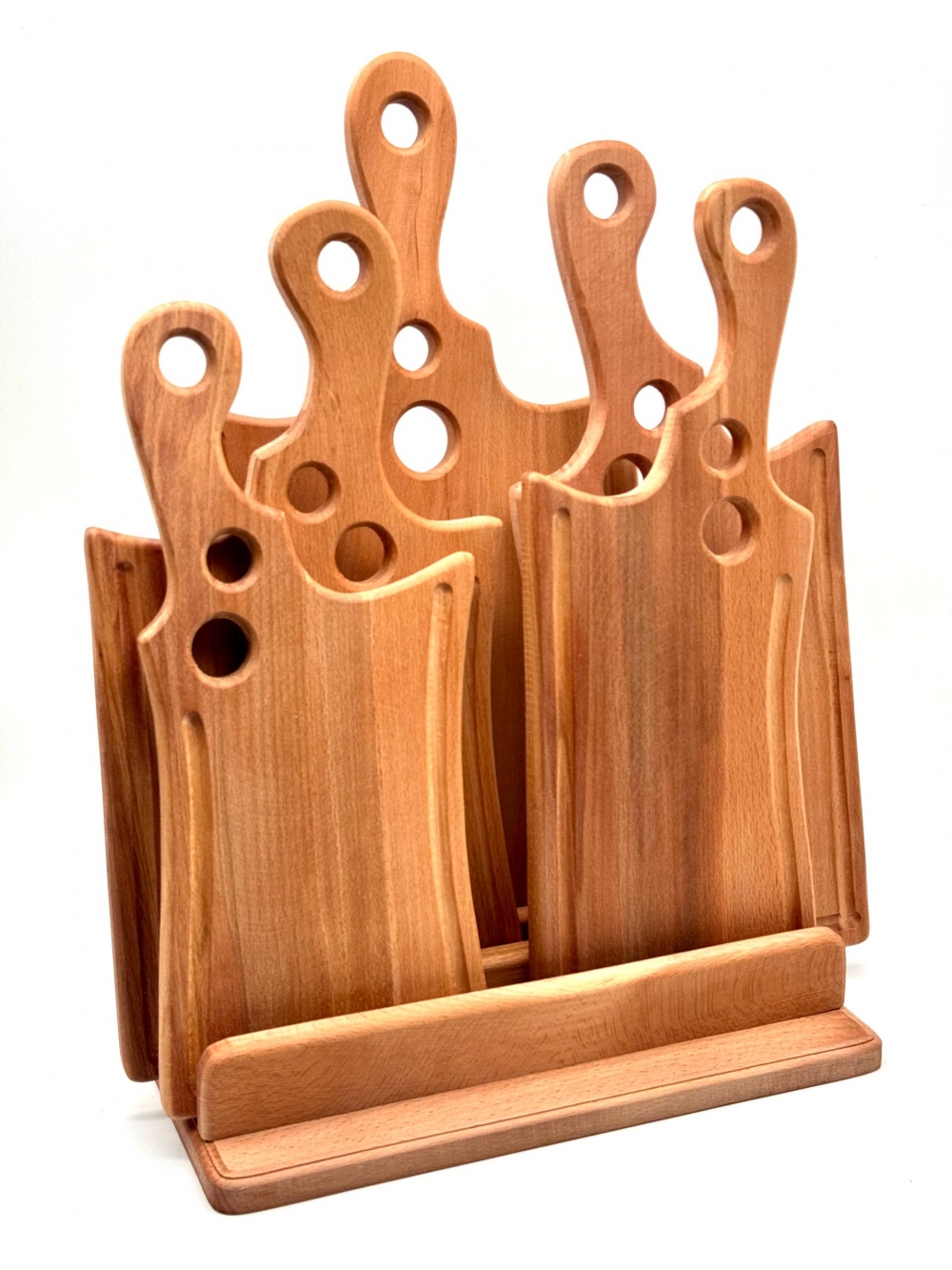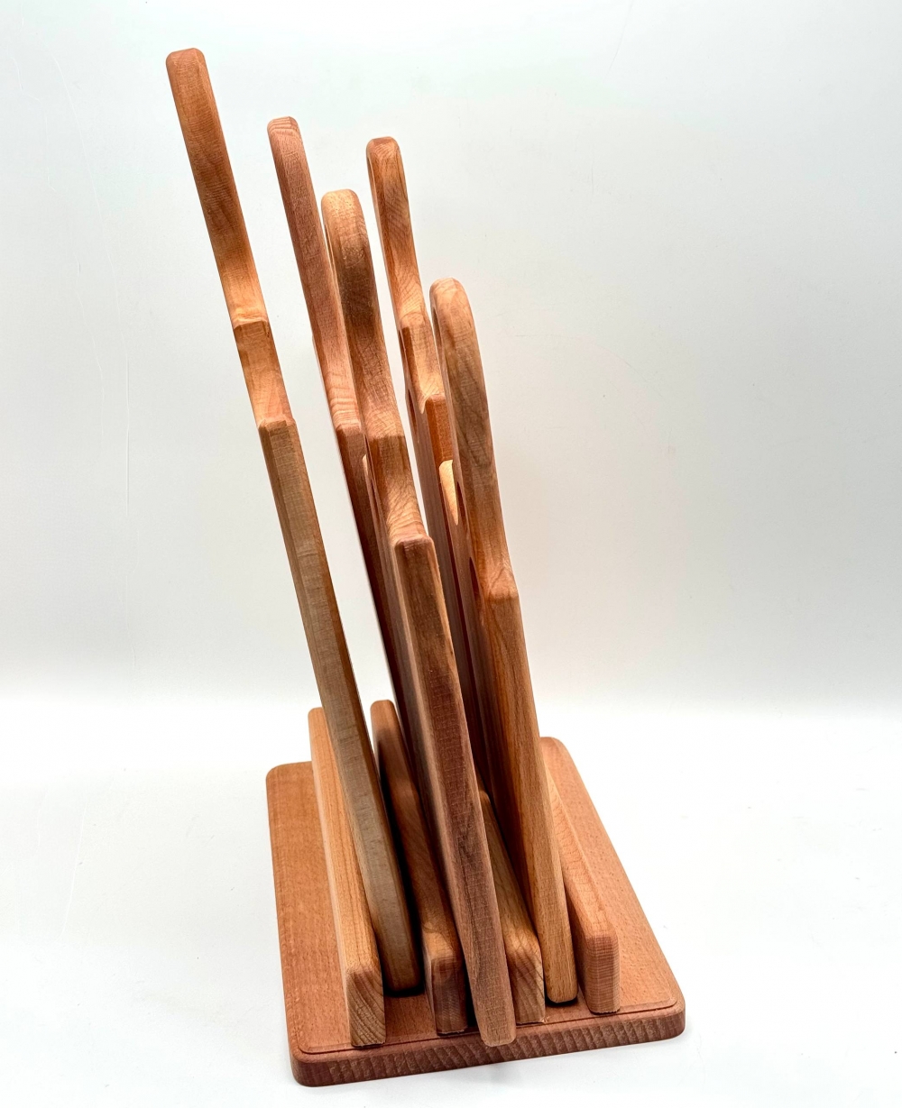 Набір дерев’яних дощок для подачі на підставці з натурального бука. У комплект входять 6 дощок із зручними ручками та отворами для сервірування і підвішування. Ідеально підходять для подачі сирів, м’ясних нарізок, закусок та фуршетів