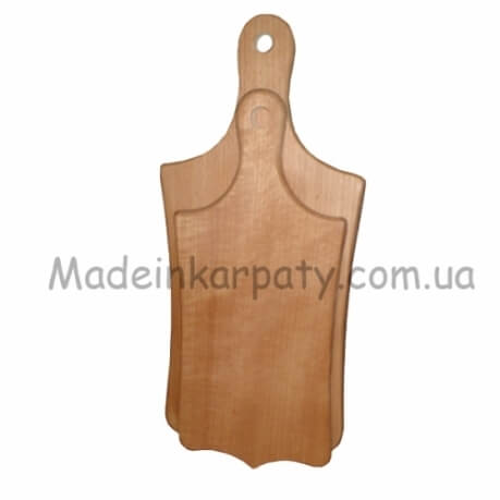 Кухонні дерев'яні обробна дошка. Ширина 14 см, робоча довжина, 18 см, робоча довжина + рукоятка = 25 см. Ручна робота. Дошка виготовляється з вареного карпатського бука. Що робить її більш стійкою до деформацій і розколів. Призначена для нарізки невеликих фруктів і овочів.