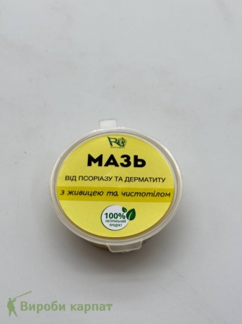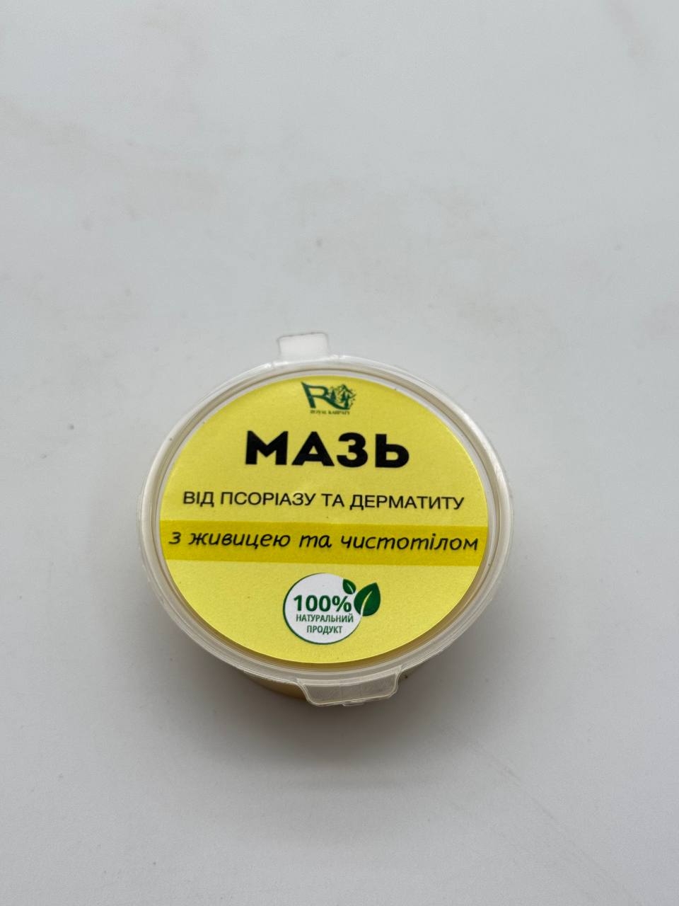 Мазь з живицею та чистотілом, натуральний засіб із загоювальними, протизапальними та антисептичними властивостями. Живиця сприяє регенерації тканин, а чистотіл заспокоює шкіру, знімає подразнення і бореться із запаленнями. Ефективна при ранах, тріщинах, екземі, псоріазі та інших шкірних проблемах