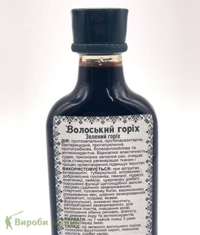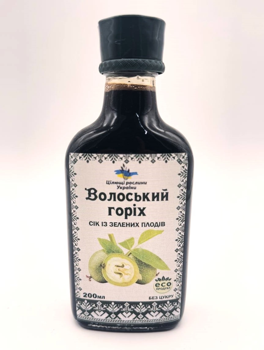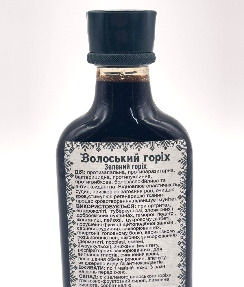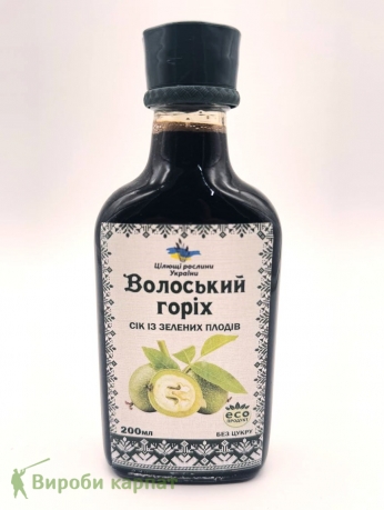 СКЛАД: сік зеленого волоського горіха, глюкозно-фруктозний сироп, лимонна кислота, сорбат калію.