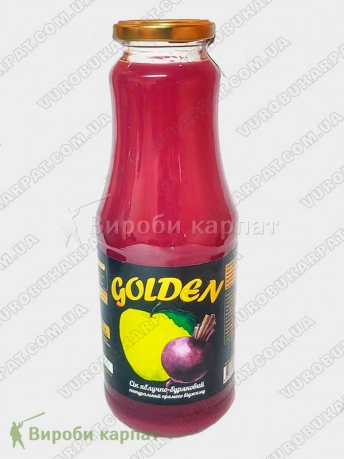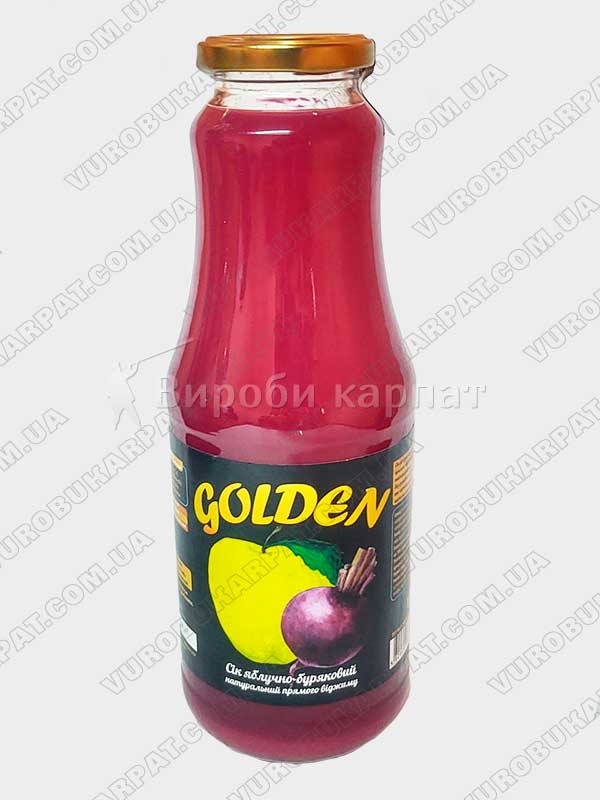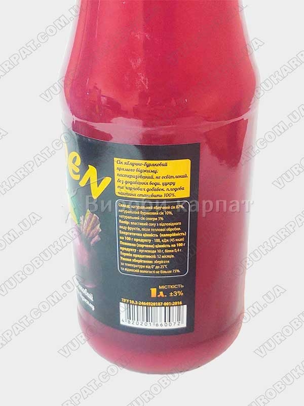 Сік яблучно буряковий 1 літр натуральний прямого віджиму без добавки води, цукру та харчових добавок, пастеризований, не освітлений. Склад: Натуральний яблучний сік 87%, Натуральний буряковий сік 10%, Натуральний сік селери 3%