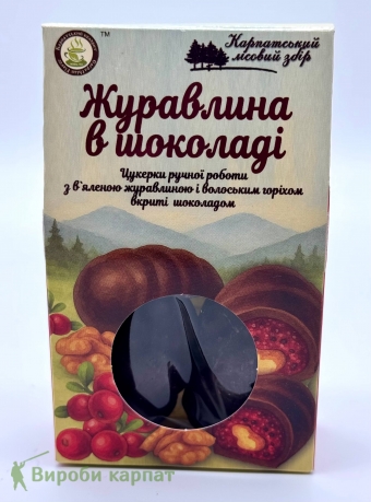 Цукерки ручної роботи з в’яленою журавлиною та ядром грецького горіха, вкриті ароматним шоколадом. Вишукане поєднання ніжної кислинки ягід, насиченого смаку горіхів і солодкої глазурі дарує справжню насолоду.