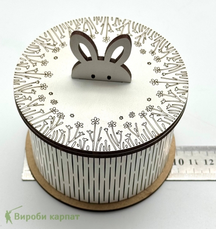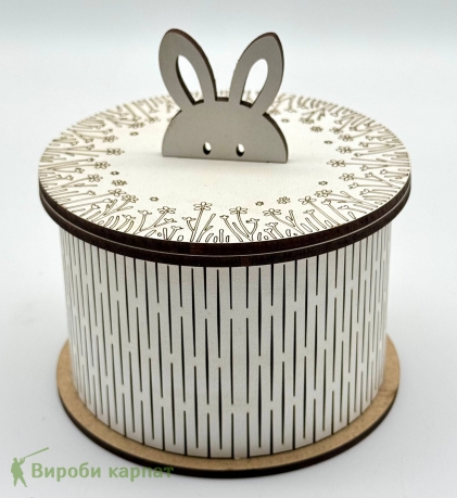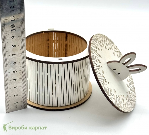 Декоративна кругла коробочка з кришкою у формі зайчика – стильне та практичне рішення для зберігання дрібниць, солодощів або подарунків. Виготовлена з фанери. Ідеально підійде для дитячої кімнати, святкового декору або як оригінальна подарункова упаковка