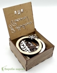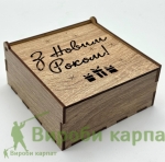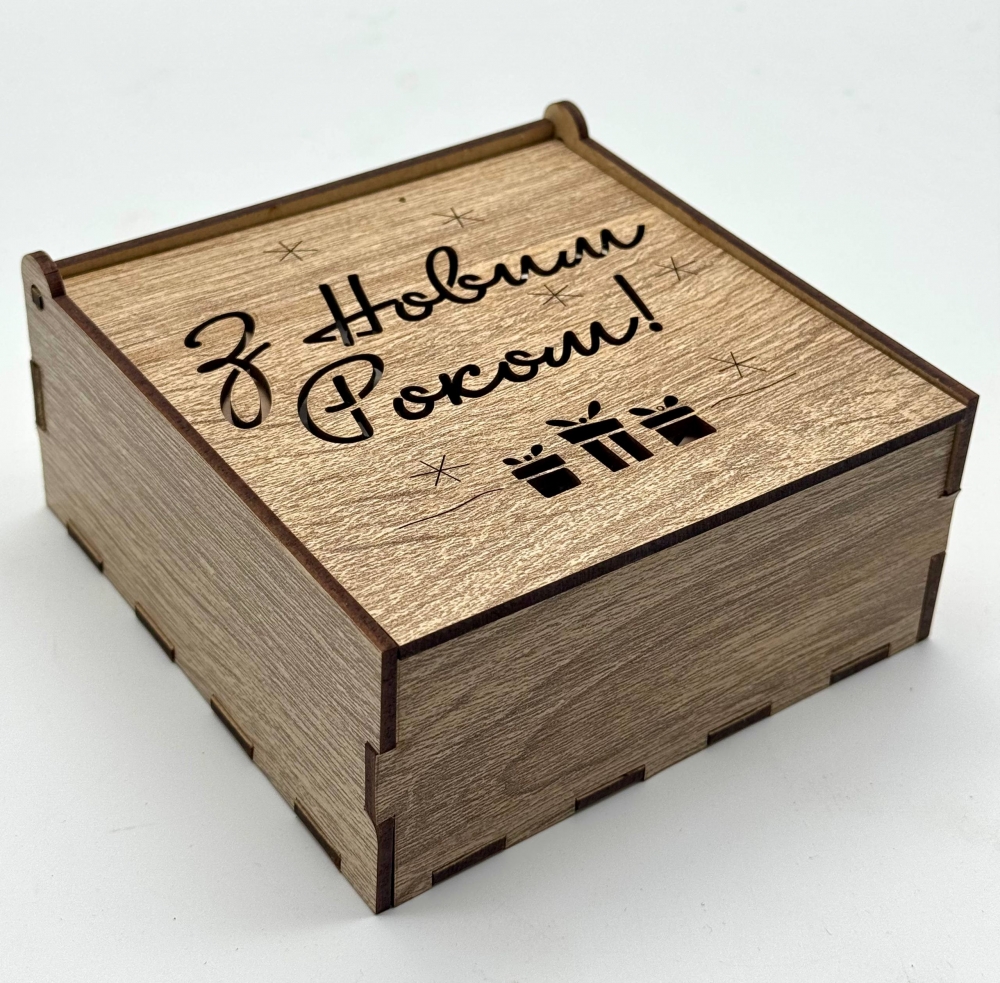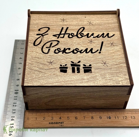 Кришка оздоблена різьбленим написом “З Новим Роком!” та декоративними символами подарунків.