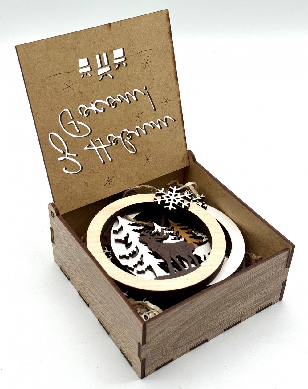 Вишуканий святковий набір із трьох дерев’яних підвісних прикрас у тематичній коробці з лазерним гравіюванням.