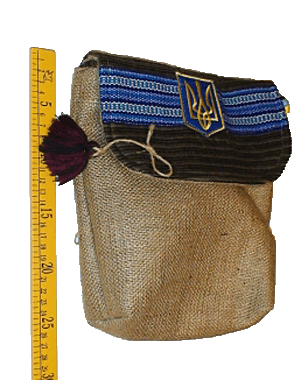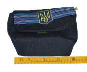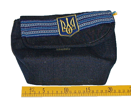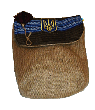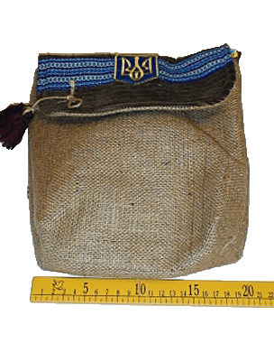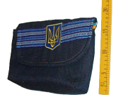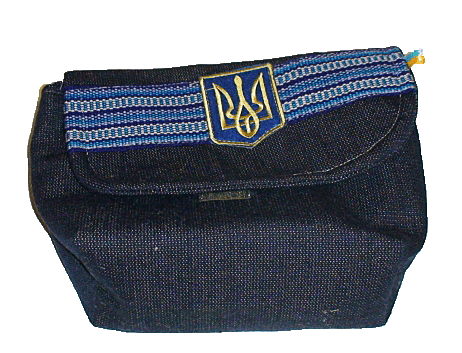Сумка с элементами тканого полотна, на лицевой части вышивка с тризубом.