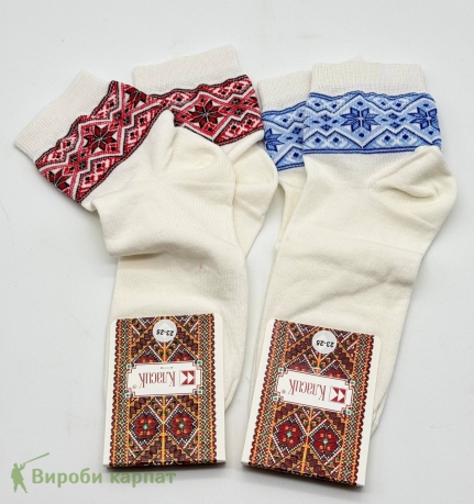 Детские носки с украинским орнаментом — сочетание комфорта, качества и традиций. Мягкие и приятные к телу, отлично держат форму и подходят для повседневного ношения. На манжете — вышитый узор в синих или красных тонах, придающий изделиям национальный колорит